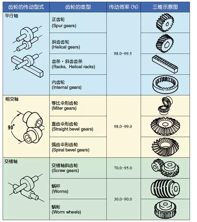 上表中所列出的齒輪效率為傳動效率,不包括軸承及攪拌潤滑等的損失。平行軸及相交軸的齒輪副的嚙合,基本上是滾動,相對的滑動非常微小,所以效率高。交錯軸斜齒輪及蝸桿蝸輪等交錯軸齒輪副,因為是通過相對滑動產生旋轉以達到動力傳動,所以摩擦的影響非常大,與其他齒輪相比傳動效率下降。齒輪的效率是齒輪在正常裝配狀況下的傳動效率。如果出現安裝不正確的情況,特別是錐齒輪裝配距離不正確而導致同錐交點有誤差時,其效率會顯著下降。